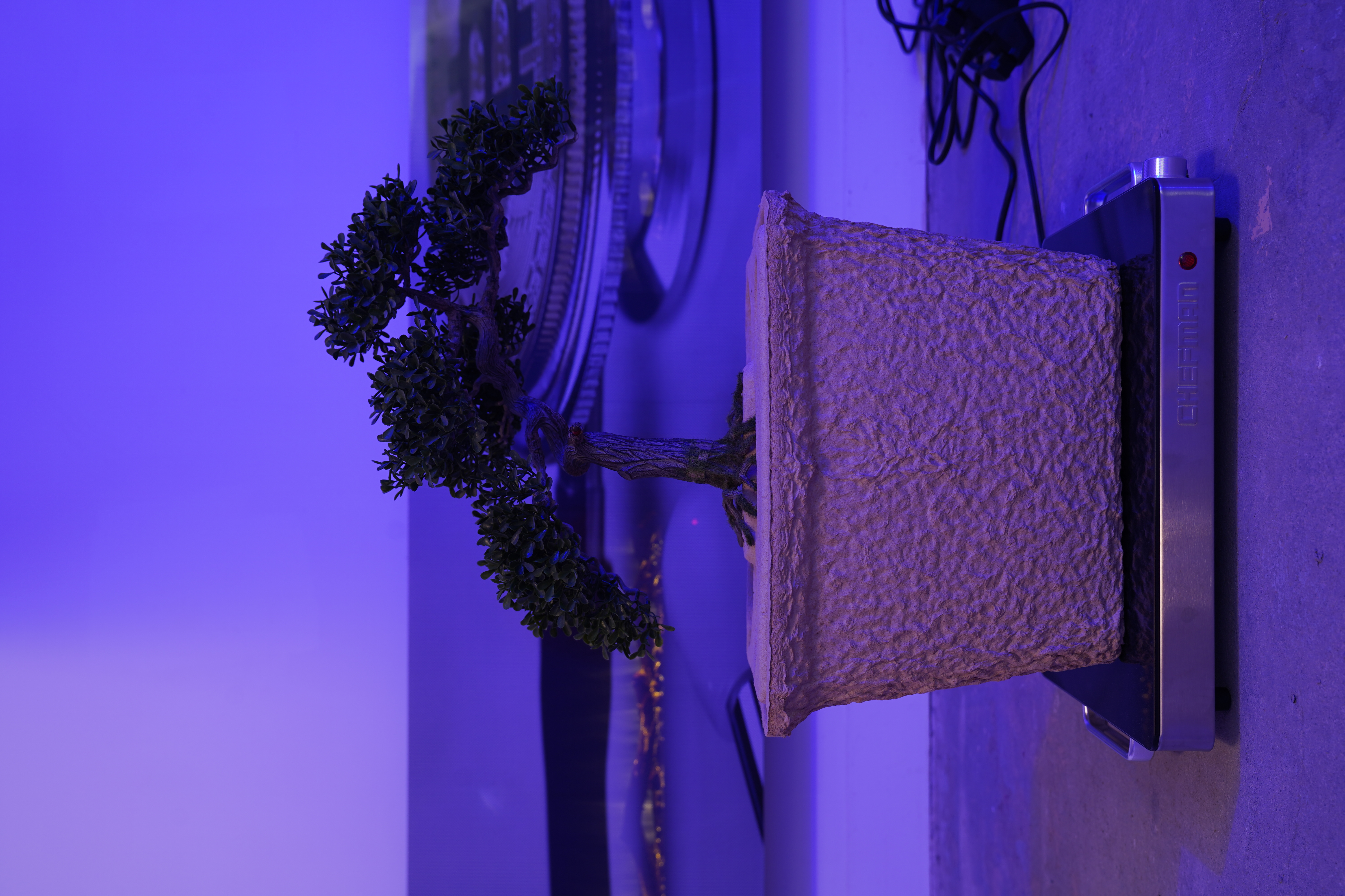 Wiebe, who also holds a healthy ambivalent relationship with photographic images, deploys them more sparingly albeit physically in the exhibition. The aftershocks of a recent tragic event involving a fire that consumed his and several local artists’ studios along with years of work continue to be an animating presence in Wiebe’s recent work. Heat, fire, and electrical circuits are all present traces in the exhibition. A flat-screen electric fireplace is obscured by a perforated cursed image which was once banner ad that followed him through his web browser for weeks. Here, as a perforated print, we see the flames of the electric fireplace looming behind the image, creating a kind of double image. The image/object combinations are extended with their wires cascading haphazardly across the room mimicking a scene from the artist’s former studio where multiple cables and extensions crossed perilously. An impulse that developed from anxieties precipitated by the tragic event saw Wiebe investigating various alternative (read: new age-y) burial, cremation, funeral practices, and the many, at times, skewed ways people cope with grief. It was an impulse I observe as falling between Freud’s description of the death drive and its opposite. Wiebe’s selected objects and sculptural images both make a bid for a kind of ‘transcendence’, maybe divine or maybe not. This elusive middle space is somewhere not in this chaotic world nor in the unknown place of death. Nonetheless, there’s a constant flirtation with that null unknown place. Wiebe is attuned to the growing, often hokey culture of spirituality, healing crystals, inspirational stones, juice-cleanses, all-natural everything, and the unending purchases one can make to reach that transcendent bliss. From this, Wiebe creates his own burial sculptures that include a Himalayan salt rock urn. The Himalayan salt rock urn is a biodegradable water burial option for grievers who want their lost loved ones to be one with nature. The salt rock urn dissolves naturally over time when released into a body of water. Here, Wiebe has devised his own slanted satirical version with an UltraSonic cleaner--a portable dishwasher of --as the container for the fluid that slowly dissolves the salt rock urn over the course of the exhibit. There’s another version of these alternative burial props Wiebe transposes askew in the form of a bonsai tree urn with a biodegradable cooler for a plant pot heated by a hot plate. It is also another burial trend where deceased loved ones’ ashes are used as fertilizers or soil for germinating new life. The urns are used as the plant pot that feeds this new growth. The bonsai tree, long before it was brought to North America, has a history tracing back to Japanese Zen Buddhism where it gained its name and before that, adopted from an even longer Chinese horticultural craft history, often practiced by the wealthy. It is part of these histories that the bonsai tree we know today continues to be viewed in some contexts as a symbol of good fortune, peace, harmony, and rife with meditative qualities. Wiebe’s bonsai tree, like Holmes jade, are both fake although both are symbols associated with good luck. They are removed from the actual. They make empty promises. These objects and images of objects urge to get closer to something beyond but come up with mere chimera. Photos have a way of seducing with believable illusions and both Wiebe and Holmes are aware and okay with its transitory alluring surface. For them, it is a starting point to dwell even if temporarily.